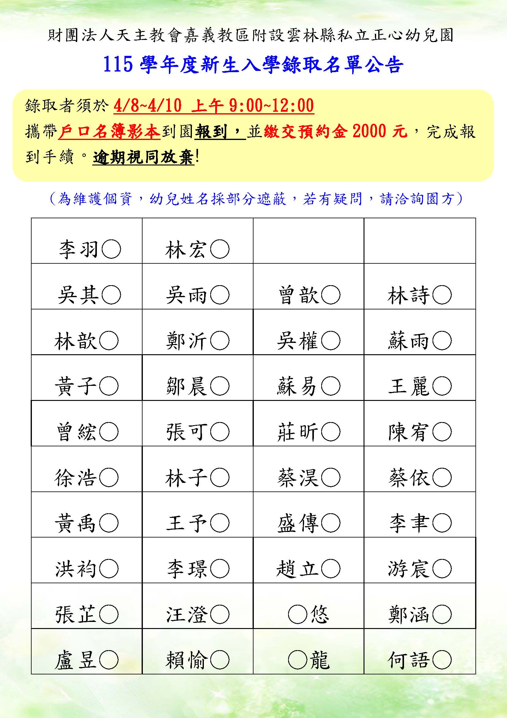 115學年度新生入學錄取名單公告